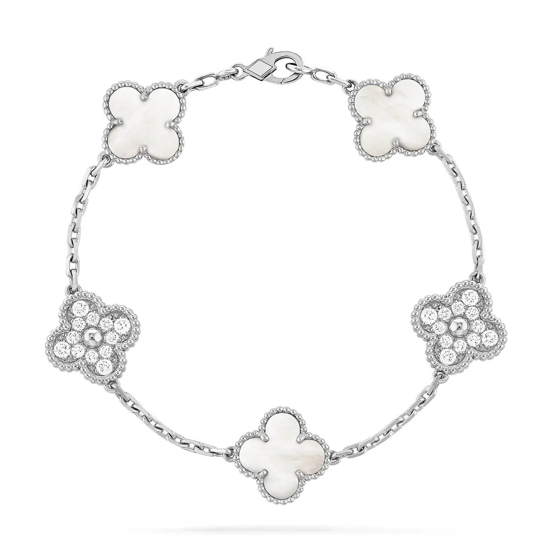 CLOVER WHITE PEARL MOP 5 MOTIF BRACELET COLLECTION – Silver-Diamond, 19