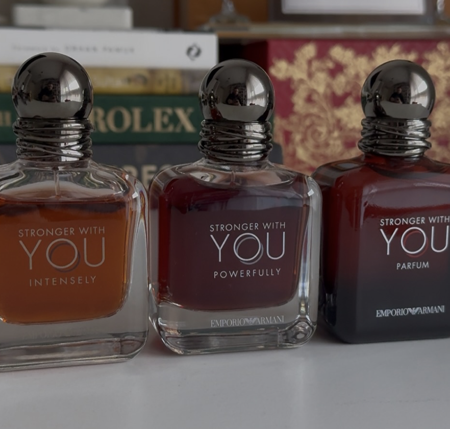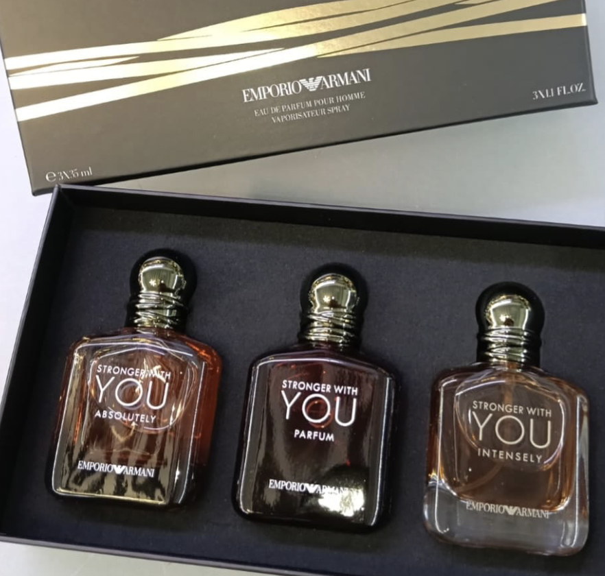 Presented in a sleek black Emporio Armani gift box with refined gold detailing, this Stronger With You miniature set exudes modern elegance and masculinity. The box opens to reveal a soft, dark velvet-lined interior that perfectly showcases three iconic fragrances: Stronger With You Absolutely, Parfum, and Intensely. Each bottle features the signature rounded silhouette with a polished metallic cap and rich amber tones, offering a sophisticated and visually striking display. Ideal for gifting or collecting, this set highlights the depth and character of the Stronger With Youcollection.